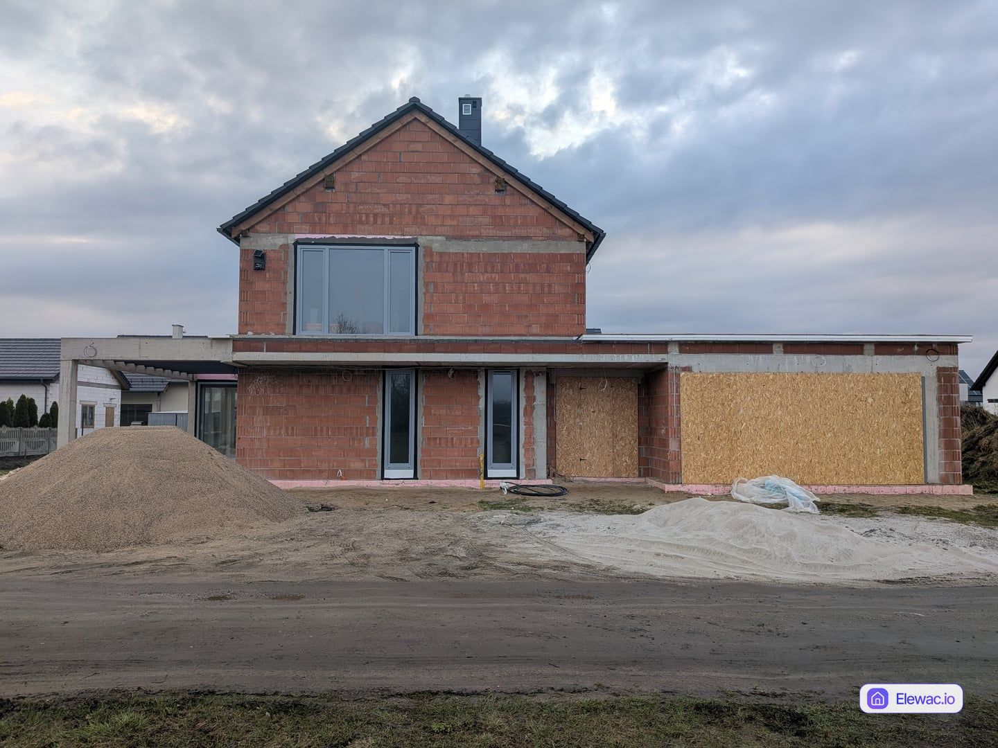 Budynek znajduje się obecnie w stanie surowym, co jest kluczowym momentem na podjęcie decyzji o ostatecznym wyglądzie fasady. Ściany z pustaka ceramicznego i betonowe nadproża są w pełni odsłonięte, a otoczenie domu to typowy plac budowy z hałdami piasku. Brak izolacji termicznej i jakichkolwiek warstw wykończeniowych sprawia, że bryła wydaje się ciężka i pozbawiona detali architektonicznych.