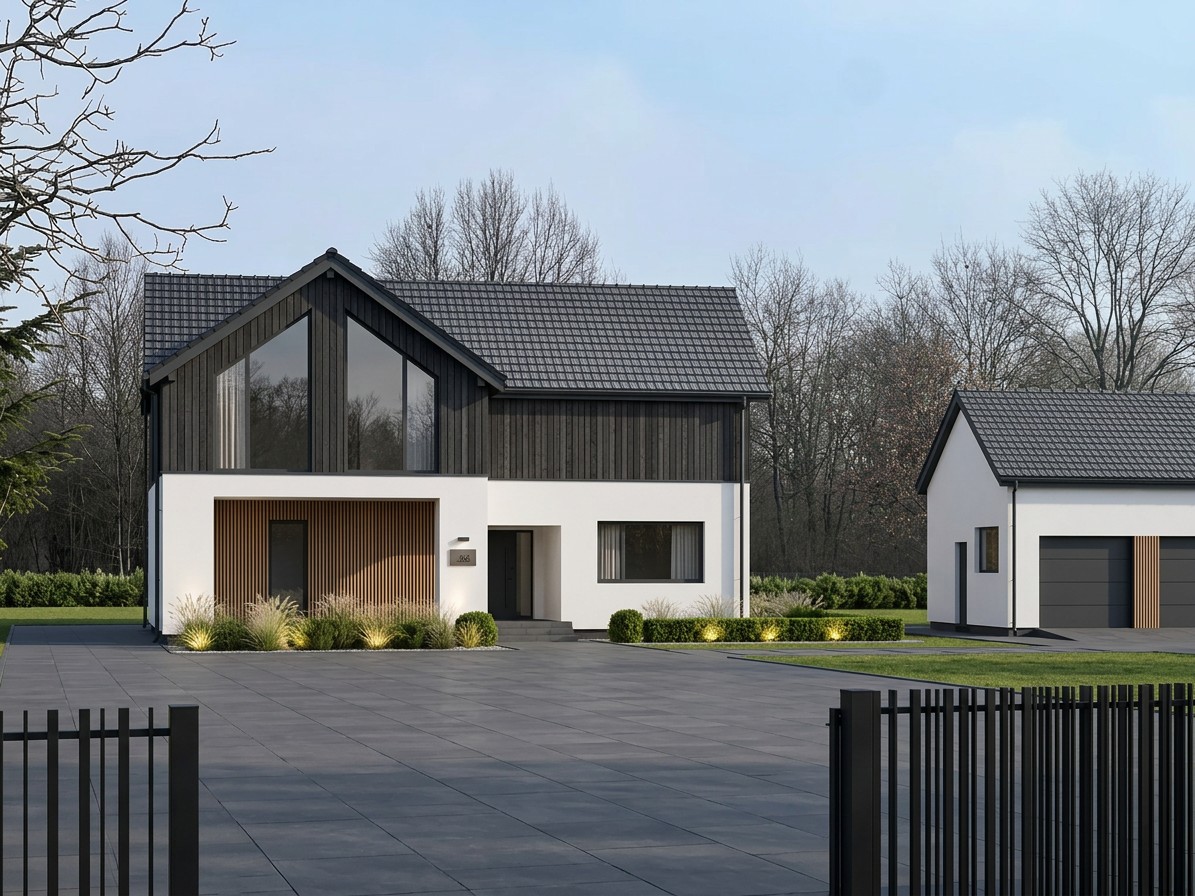 Wizualizacja proponuje estetykę modern farmhouse, łączącą biały tynk silikonowy RAL 9016 z ciemną, pionową szalówką na poziomie poddasza. Koncepcja przewiduje również akcenty z drewnianych lameli w strefie wejściowej, co tworzy wyraźny kontrast z antracytową dachówką.