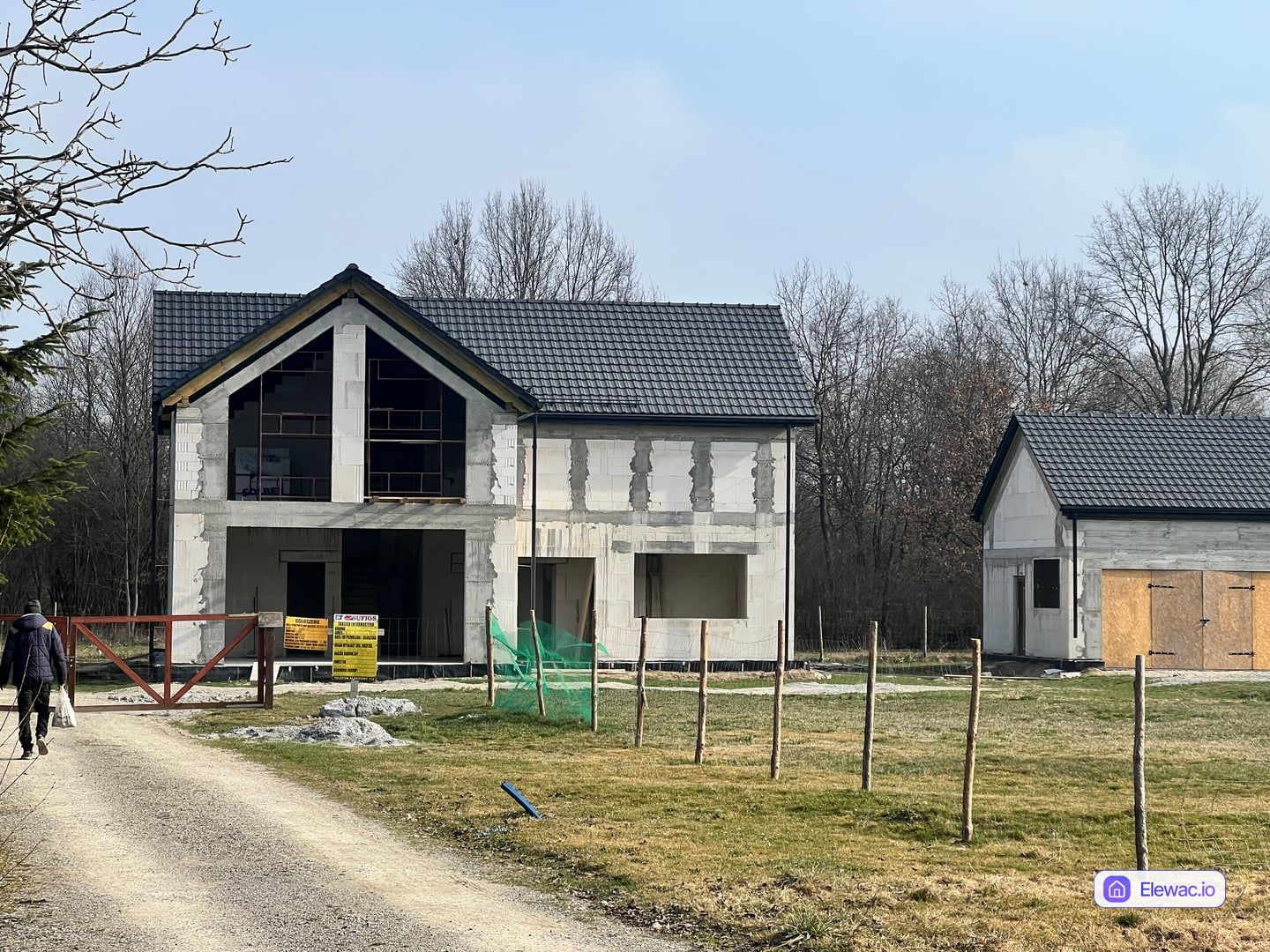 Dom jednorodzinny znajduje się obecnie w stanie surowym, z widocznymi ścianami z bloczków gazobetonowych i brakiem warstwy izolacyjnej. Budynek wymaga kompleksowego wykończenia, w tym montażu stolarki okiennej oraz wykonania systemu ocieplenia, co jest typowe dla nowych inwestycji przed etapem elewacyjnym.