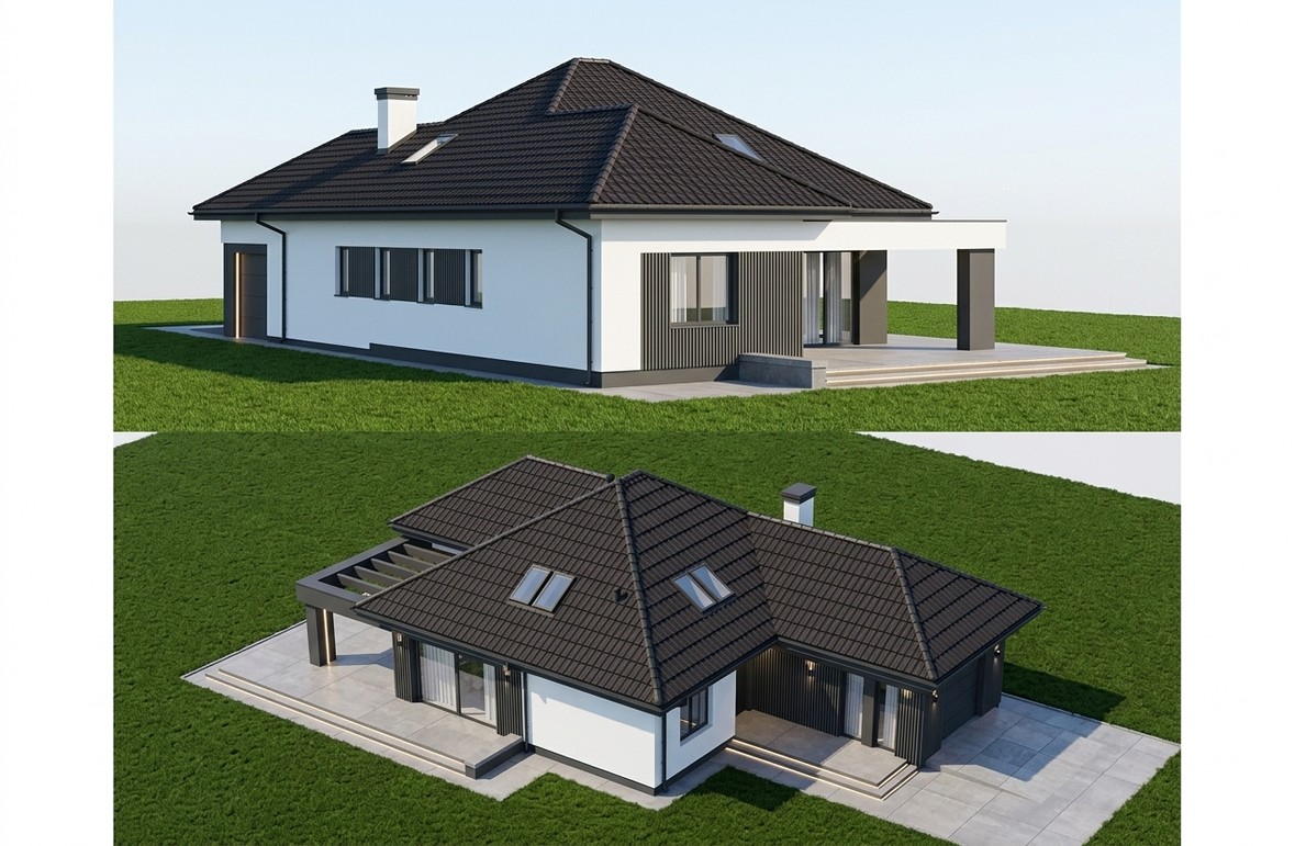 Wizualizacja proponuje odejście od tradycyjnego drewna na rzecz pionowych lameli w kolorze grafitowym RAL 7016. Koncepcja zakłada zastosowanie tynku silikonowego w odcieniu czystej bieli RAL 9016, który posiada właściwości samoczyszczące i wysoką paroprzepuszczalność. Ciemne lamele rozmieszczone w strefie wejściowej oraz przy tarasie tworzą wyraźny kontrast i nadają budynkowi bardziej techniczny sznyt. Propozycja przewiduje także ujednolicenie kolorystyki stolarki okiennej i obróbek blacharskich z nowymi elementami dekoracyjnymi, co porządkuje wygląd całej bryły.