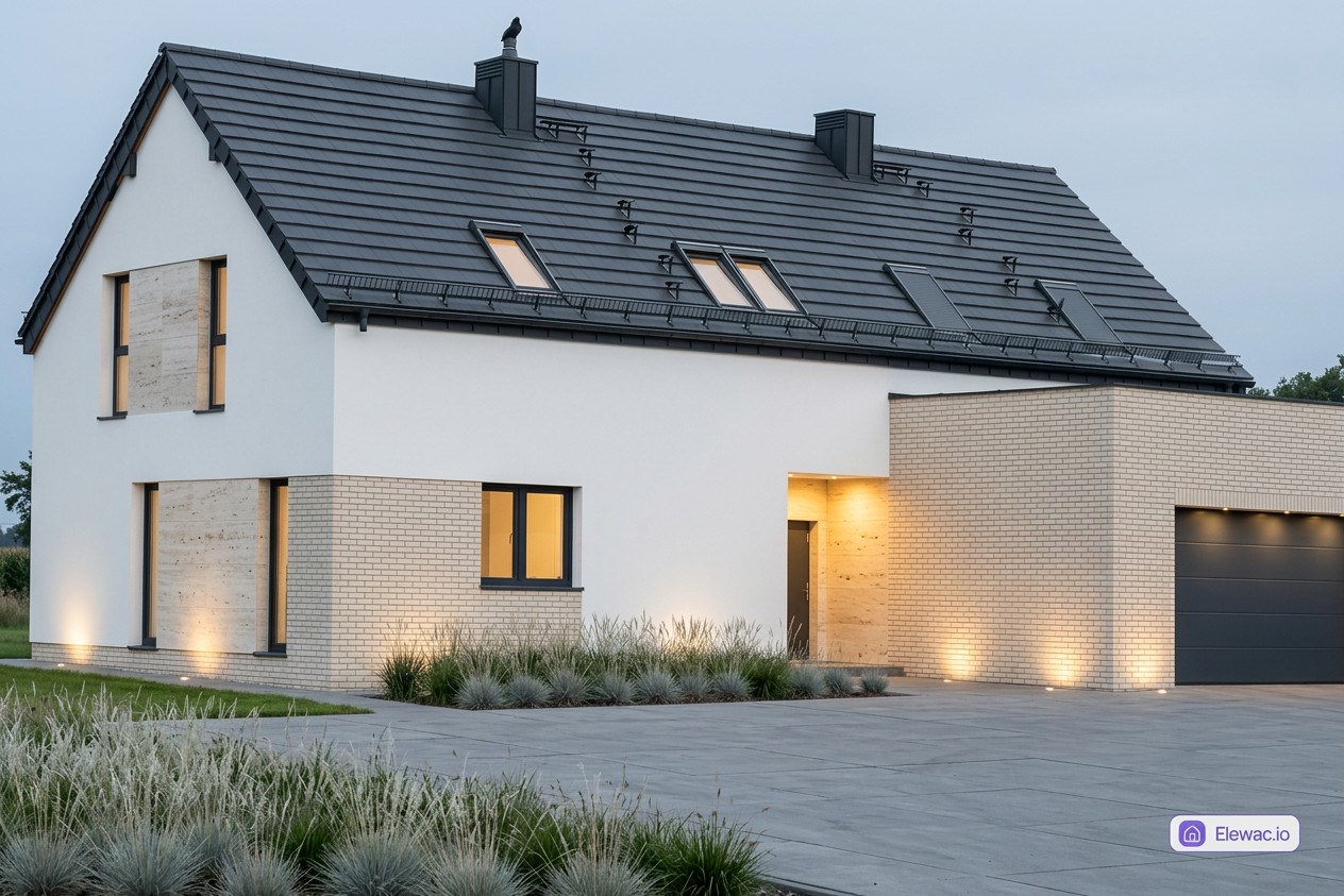 Wizualizacja AI proponuje estetykę Modern Farmhouse, łączącą biały tynk silikonowy RAL 9016 z jasną cegłą klinkierową. Koncepcja zakłada dodanie tynku dekoracyjnego o strukturze trawertynu między oknami, co tworzy kontrast z ciemną dachówką.