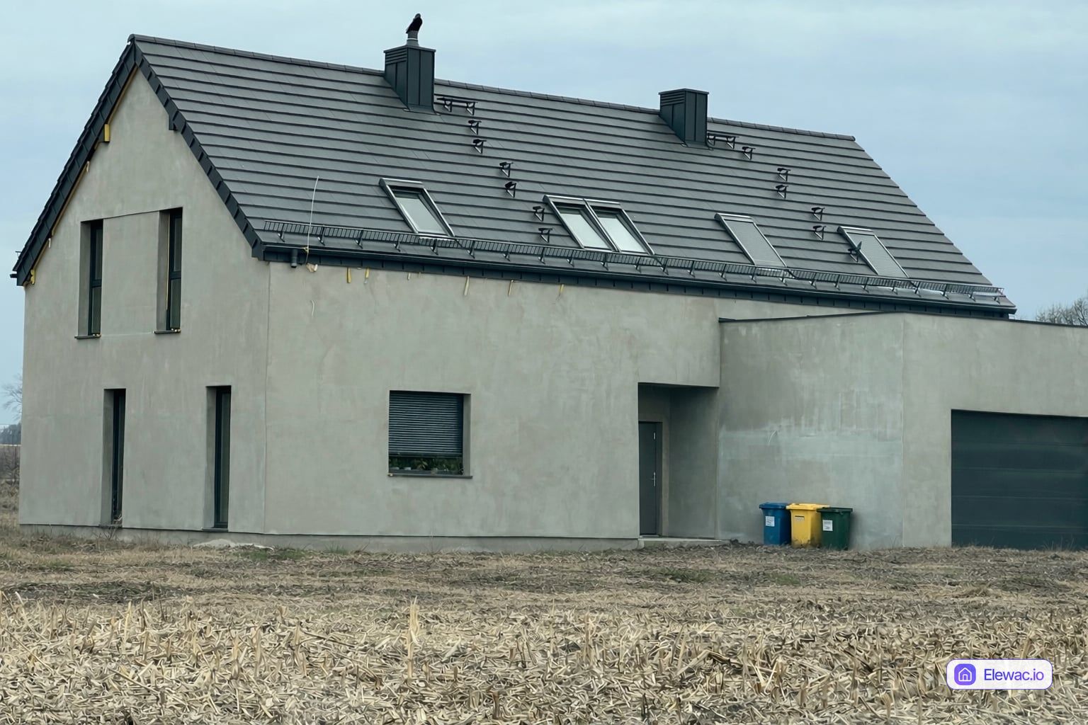Budynek w obecnym stanie to nowoczesna bryła wykończona jedynie szarym tynkiem podkładowym, co nadaje mu surowy i niedokończony wygląd. Brak detali architektonicznych sprawia, że elewacja jest monotonna i pozbawiona głębi, przypominając typowy dom w stanie deweloperskim do wykończenia.