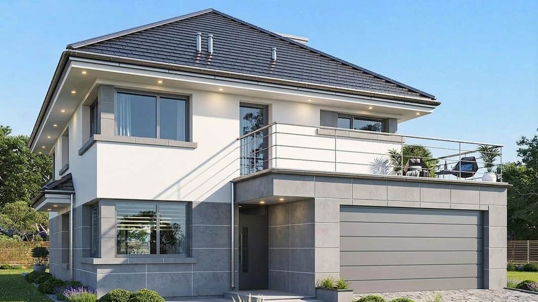Wizualizacja AI przedstawia propozycję modernizacji, która opiera się na uspokojeniu fasady. Koncepcja zakłada usunięcie drobnych elementów na rzecz szarych płyt betonowych o dużym formacie. Proponowany materiał to płyty włóknocementowe lub beton architektoniczny montowany na podkonstrukcji. Szarość w odcieniu RAL 7037 na parterze i obramowaniach okiennych tworzy bazę dla białego tynku silikonowego na piętrze. Taki układ podkreśla horyzontalne linie budynku i porządkuje strefę wejściową oraz garażową.