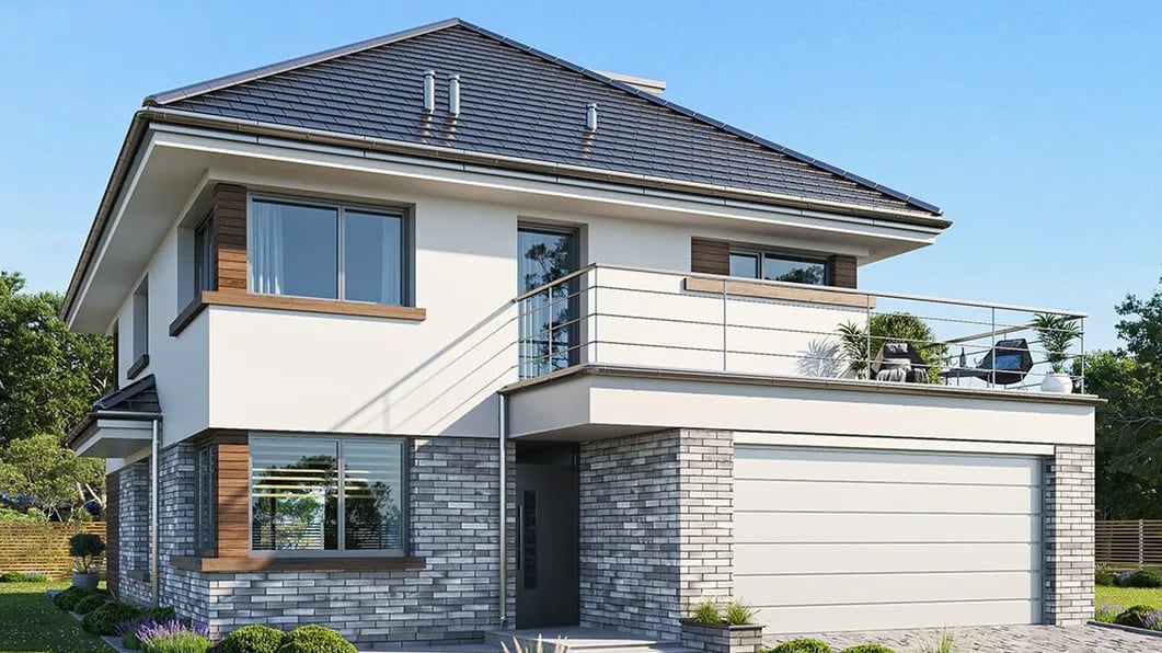 Współczesny dom jednorodzinny charakteryzuje się rozdrobnioną strukturą wykończenia parteru drobnymi płytkami kamiennymi. Elewacja z okresu współczesnego wymaga odświeżenia estetycznego, aby wyeliminować wizualny chaos wprowadzony przez wielokolorowe okładziny i drewniane detale.