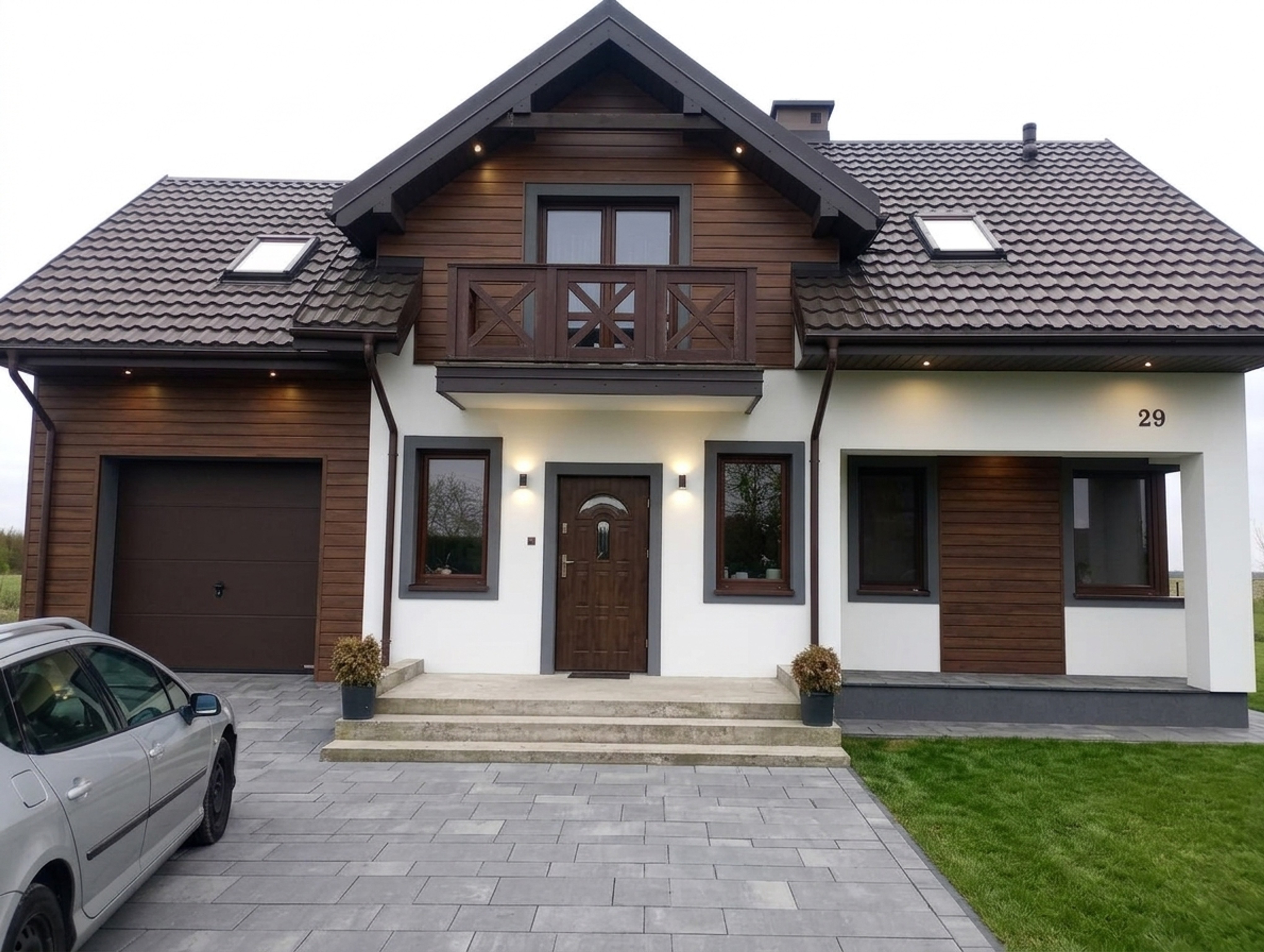 - Brak dekoracji sciennych → ciemna deska elewacyjna w szczytach i przy garazu