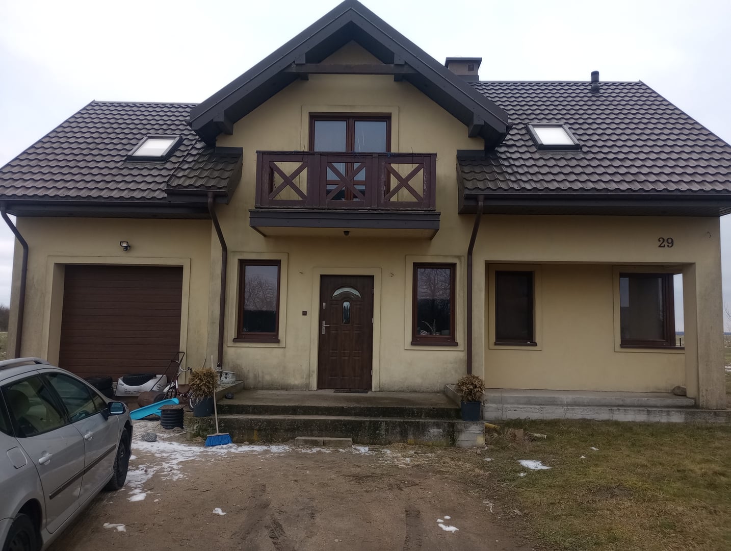 Ten dom jednorodzinny z lat 2000. posiada typowa dla tamtego okresu bezowa elewacje, która z czasem stracila swoja swiezosc. Widoczne sa liczne zabrudzenia i zacieki w strefie cokolowej, a ciemnobrazowa stolarka oraz drewniany balkon dominuja nad bryla, tworzac nieco przytlaczajacy efekt.