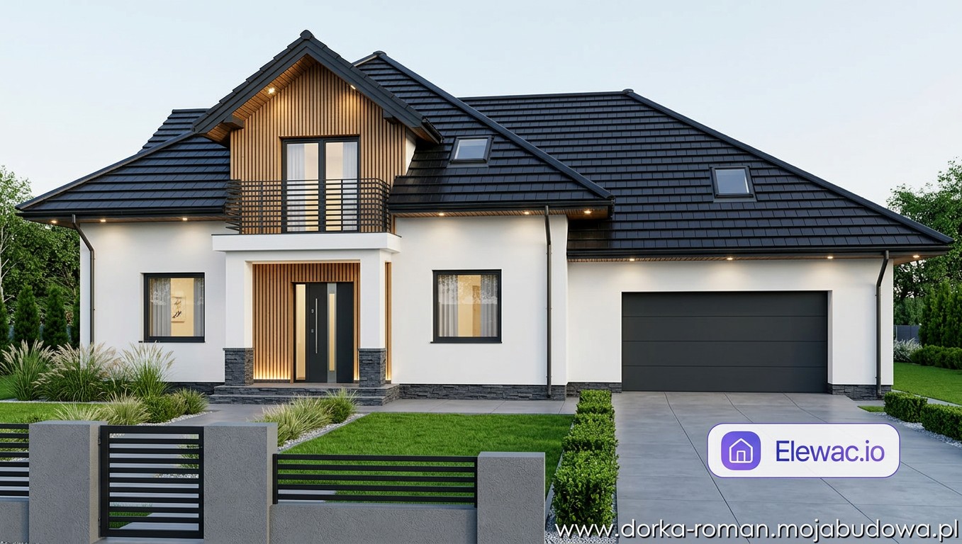 Dodanie oświetlenia zewnętrznego w podbitce dachowej to istotny element tej propozycji. Światło wydobywa fakturę drewna po zmroku i poprawia widoczność wokół garażu oraz wejścia głównego. Zastosowanie kontrastu między ciepłym drewnem a chłodnym, jasnym tynkiem silikonowym sprawia, że bryła staje się bardziej dynamiczna. Wizualizacja AI pozwala sprawdzić, jak te zmiany materiałowe wpływają na odbiór całego obiektu przed podjęciem ostatecznych decyzji o zakupie materiałów.