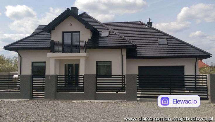 Jasna elewacja i ciemny dach to bezpieczne, ale często monotonne połączenie. Obecny stan budynku cechuje się dużą płaszczyzną białego tynku, która zlewa się w jedną całość, nie eksponując ciekawych uskoków bryły. Strefa wejściowa oraz balkon nad nią wydają się surowe, a brak wyraźnego odcięcia parteru od gruntu sprawia, że dom wygląda na osadzony bezpośrednio w żwirze bez odpowiedniego wykończenia strefy przyziemia.