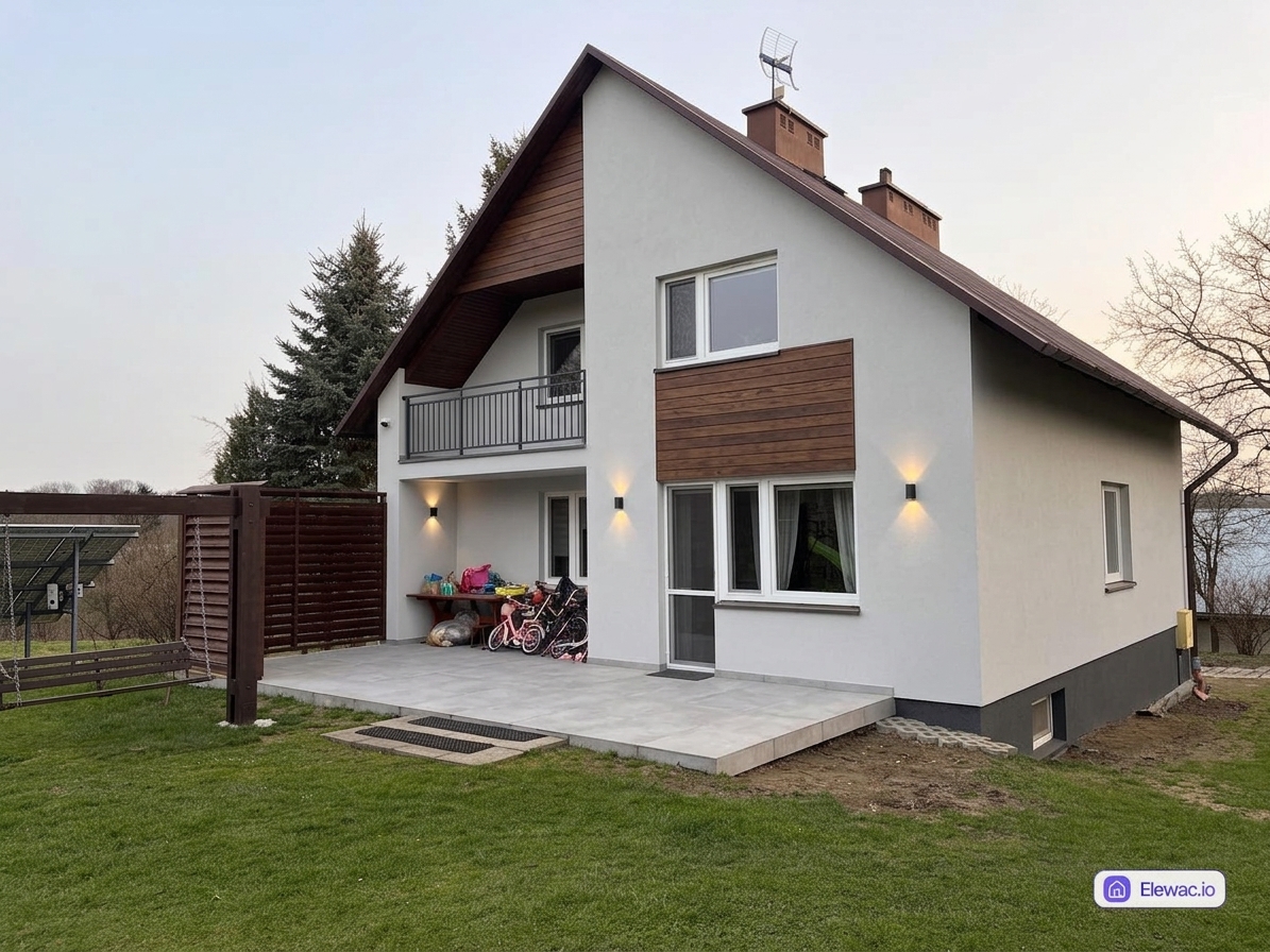 Tynk silikonowy zachowuje estetyczny wygląd nawet przez 25 lat bez konieczności malowania. Jest odporny na rozwój alg i grzybów, co jest kluczowe w przypadku jasnych elewacji narażonych na wilgoć. Modrzew termo, dzięki obróbce cieplnej, zyskuje wysoką odporność na warunki atmosferyczne i nie wymaga tak częstej konserwacji jak tradycyjne drewno. Nowoczesne kinkiety elewacyjne typu góra-dół, przewidziane w projekcie, podkreślają nową fakturę ścian po zmroku. Taki dobór materiałów sprawia, że fasada jest łatwiejsza w utrzymaniu i bardziej odporna na zmienne warunki pogodowe.