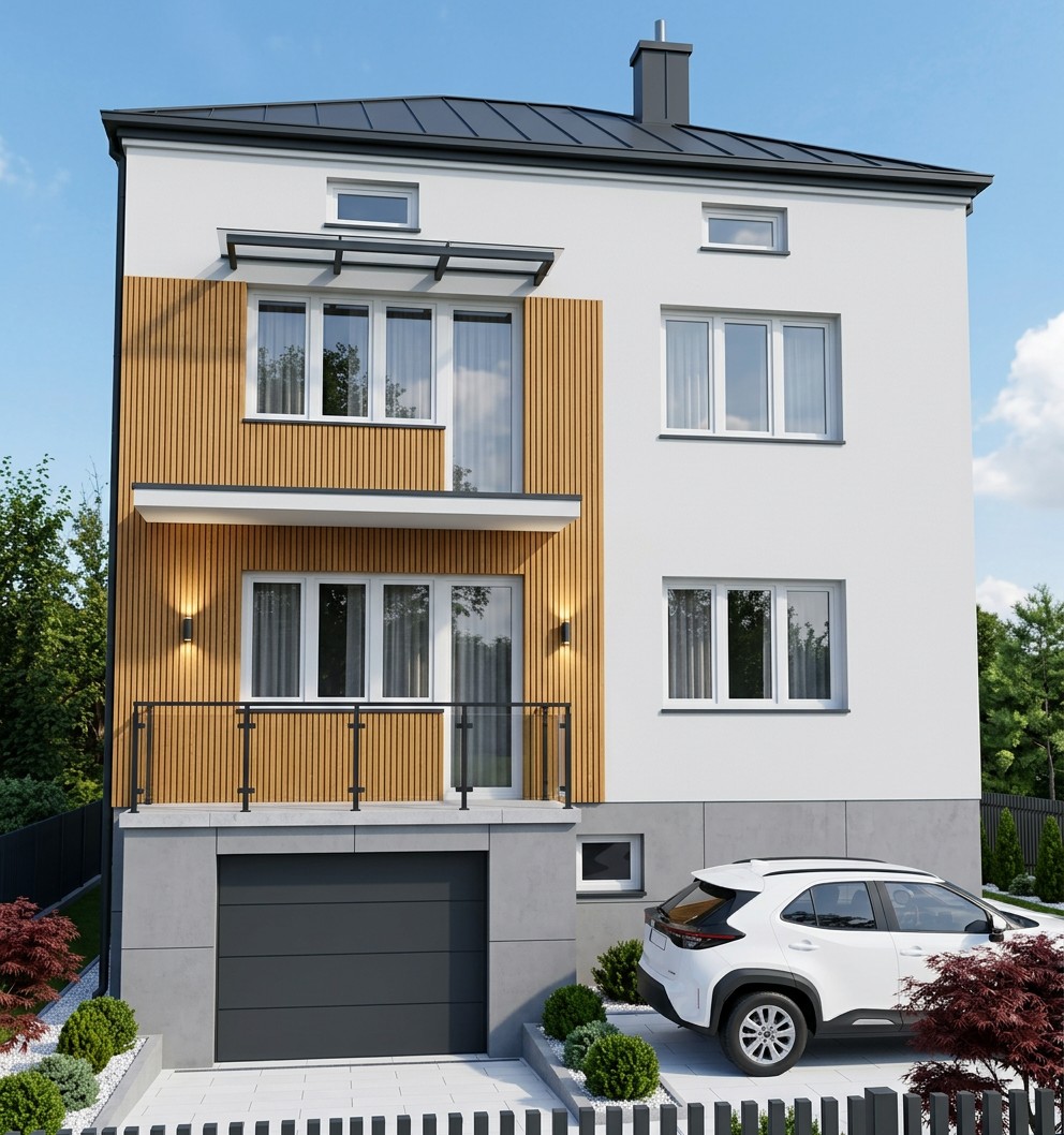 Koncepcja wizualizacji zaklada uporzadkowanie fasady poprzez wprowadzenie jasnej bazy z tynku silikonowego w kolorze RAL 9016. Kluczowym elementem propozycji jest wydzielenie pionowej sekcji wykonanej z modrzewia termo, ktora optycznie wysmukla budynek i dodaje mu naturalnego ciepla. Ciemne panele elewacyjne w strefie przyziemia oraz nowa brama garazowa w kolorze antracytowym tworza solidna podstawe dla jasnej gory budynku.