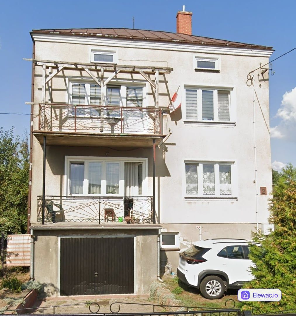 Stary dom jednorodzinny z epoki PRL, charakteryzujacy sie szarym, zabrudzonym tynkiem cementowym. Widoczna jest degradacja warstwy wierzchniej oraz przestarzale, kute barierki balkonowe wymagajace pilnej wymiany.